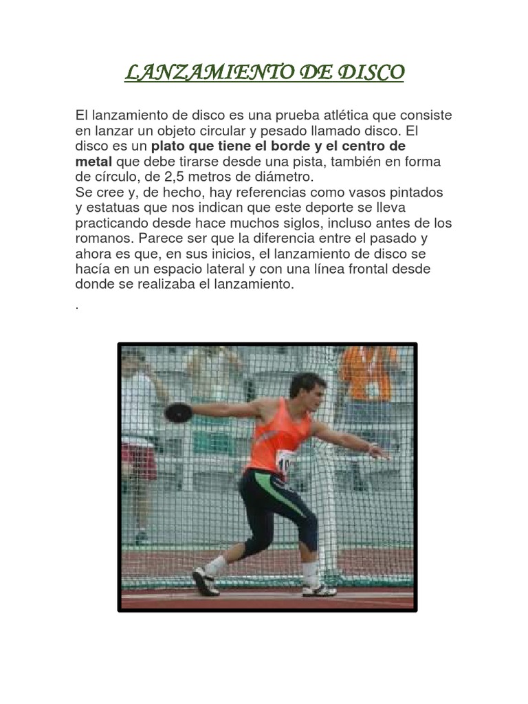 Mi experiencia en este deporte. La única evidencia antigua del lanzamiento de disco es dada por homero que habla de la realización de un festival donde se lanzaría en honor a patroclo y que era organizado por aquiles. El círculo desde donde es lanzado el disco, debe tener un diámetro de 2,5m. El lanzamiento de disco es una prueba del atletismo actual, donde el objetivo es lanzar un objeto pesado de sección circular denominado disco lo más lejos posible. Lea aquí todas las noticias sobre lanzamiento de disco: